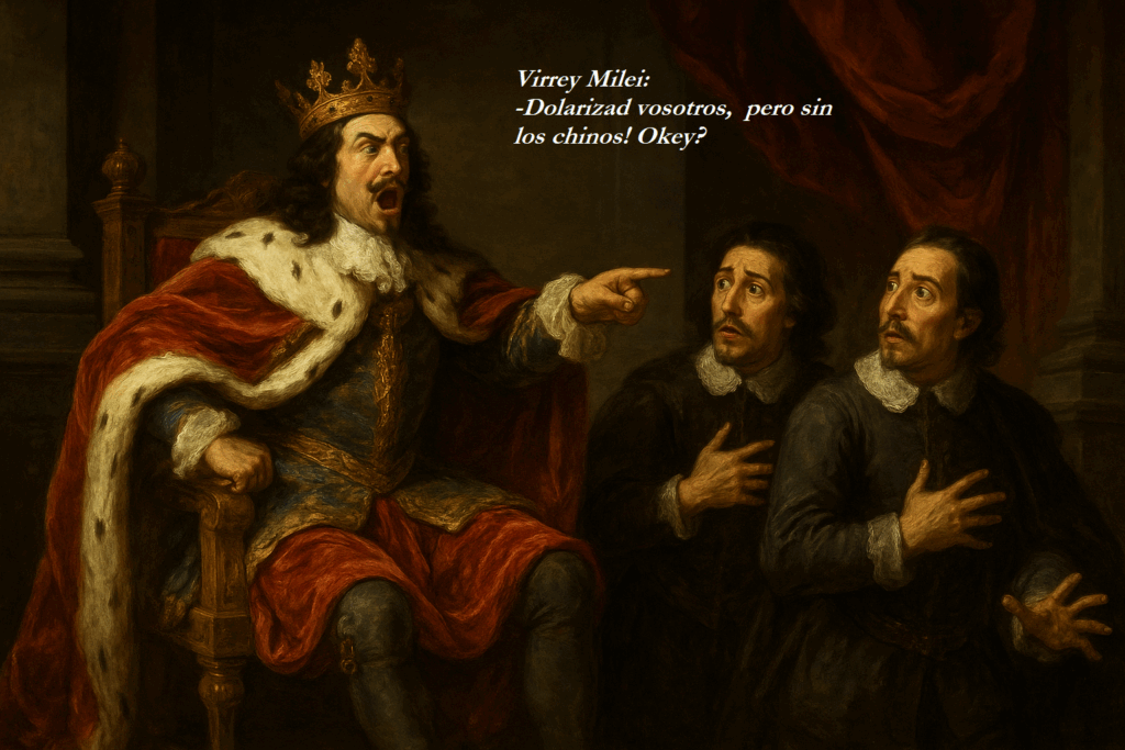 24 de septiembre de 2025 // El okey del Rey para dolarizar la economía argentina como método infalible de aspirar a la reelección. La oposición no tiene otro camino que avisar: no son deudas del gobierno argentino, son nueva deuda del partido político La Libertad Avanza. Nosotros no la vamos a reconocer institucionalmente: es un préstamo político. Como fue el préstamo récord de Trump a Macri violando los estatutos del FMI y la legislación argentina. El Gringo Schiartti y Alex Kicillof mano a mano para pacificar el país en 2027. CFK será capaz de matar a su hijo político si él no la mata primero? Perdón por la figura, pero no le entra bala que su tiempo ya pasó, so riesgo de borrar su propia grandeza al perjudicar a las mayorías por venir. Vicisitudes sanguíneas en la Argentina libertaria: a todo o nada, el revival del segundo tiempo de Cambiemos con el Toto y la Señora Bullrich a la cabeza: fiesta financiera para unos pocos, fundición récord de empresas y represión de la protesta social.